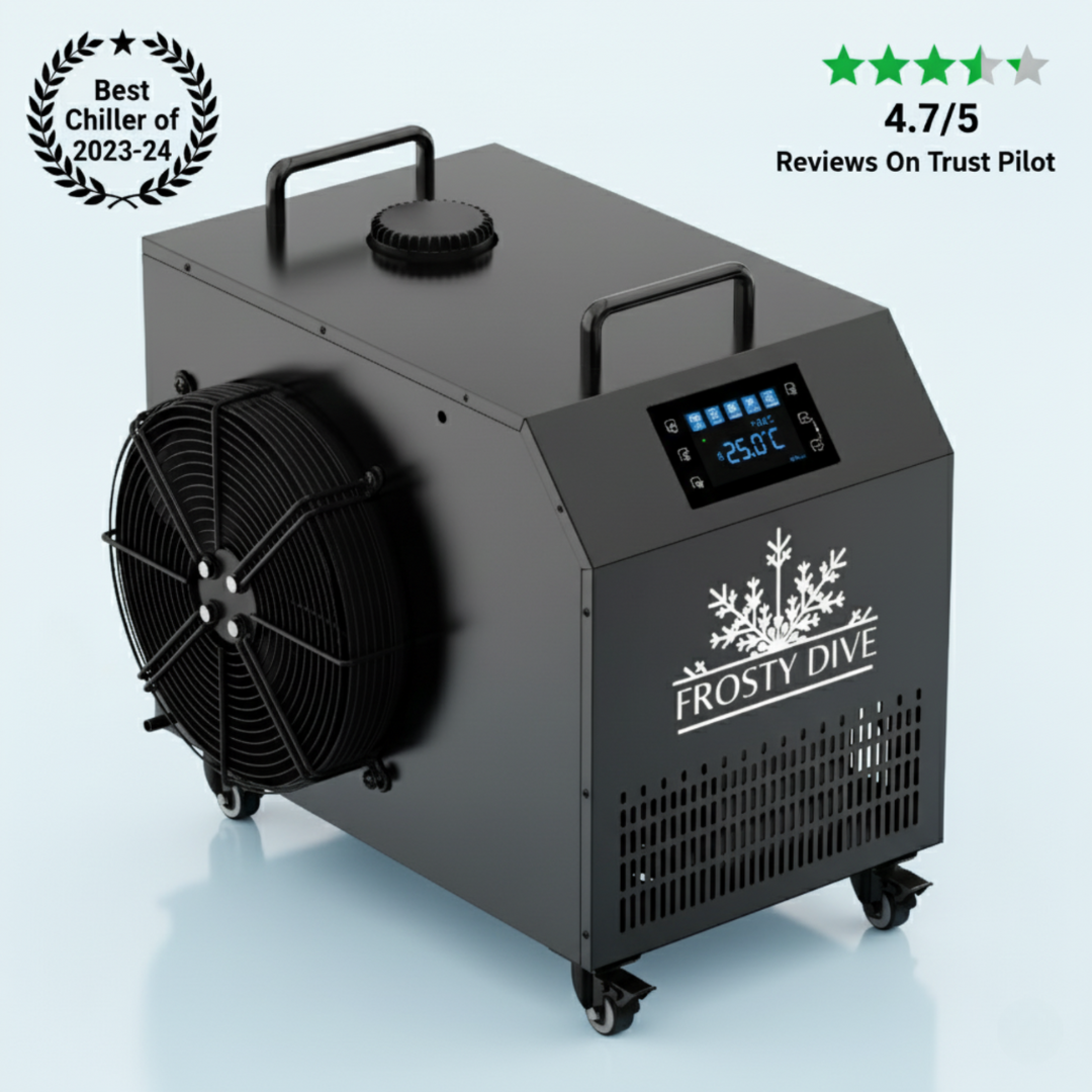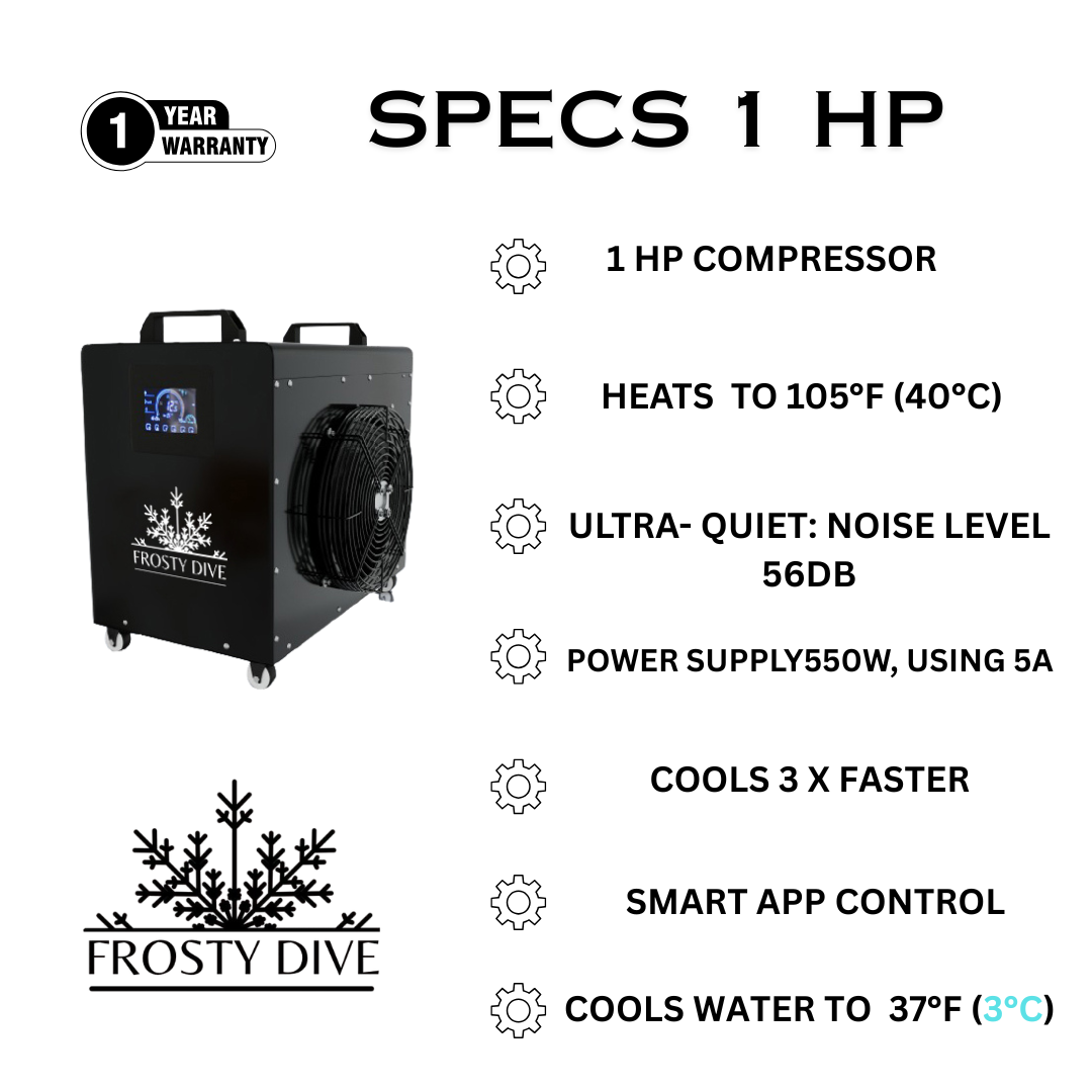Eliminate the hassle of ice with the Frosty Dive SmartCool Chiller. It quickly cools water to 37°F (3°C) and includes a 20-micron filtration system. Perfect for indoor and outdoor use, it operates efficiently with a 1/3 HP compressor at 280W, or upgrade to 1/2 HP at 550W for faster cooling. Enjoy an easy, powerful cooling experience.