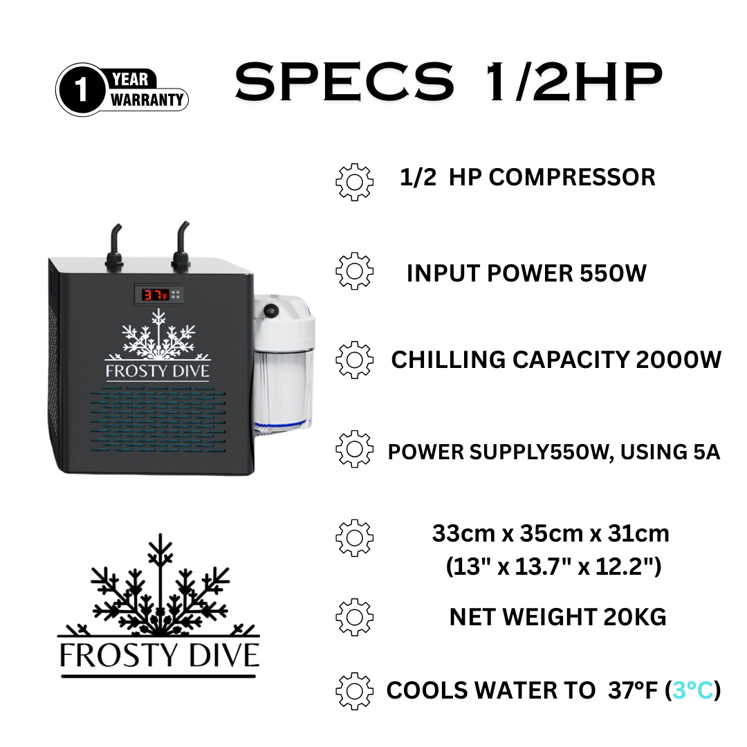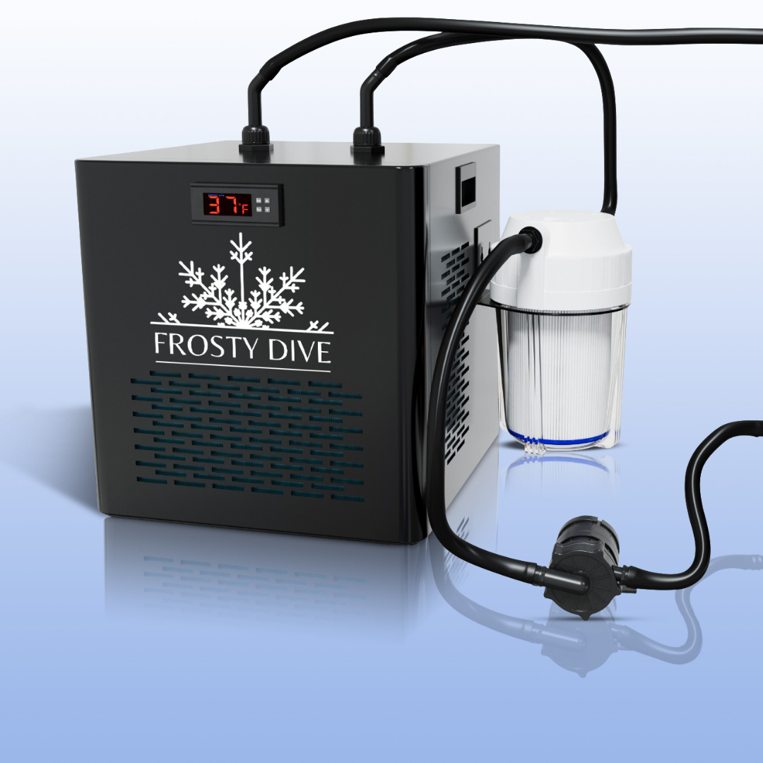 Eliminate the hassle of ice with the Frosty Dive SmartCool Chiller. It quickly cools water to 37°F (3°C) and includes a 20-micron filtration system. Perfect for indoor and outdoor use, it operates efficiently with a 1/3 HP compressor at 280W, or upgrade to 1/2 HP at 550W for faster cooling. Enjoy an easy, powerful cooling experience.