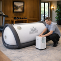 Full-length soft-shell lying chamber designed for comfortable home wellness sessions. - Oxygen concentrator/ Quiet, oil-free air compressor ( Combined Unit)