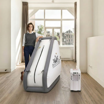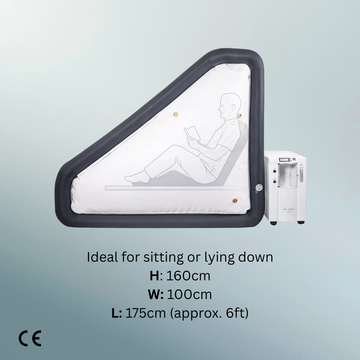 Full-length soft-shell lying chamber designed for comfortable home wellness sessions. - Oxygen concentrator/ Quiet, oil-free air compressor ( Combined Unit)