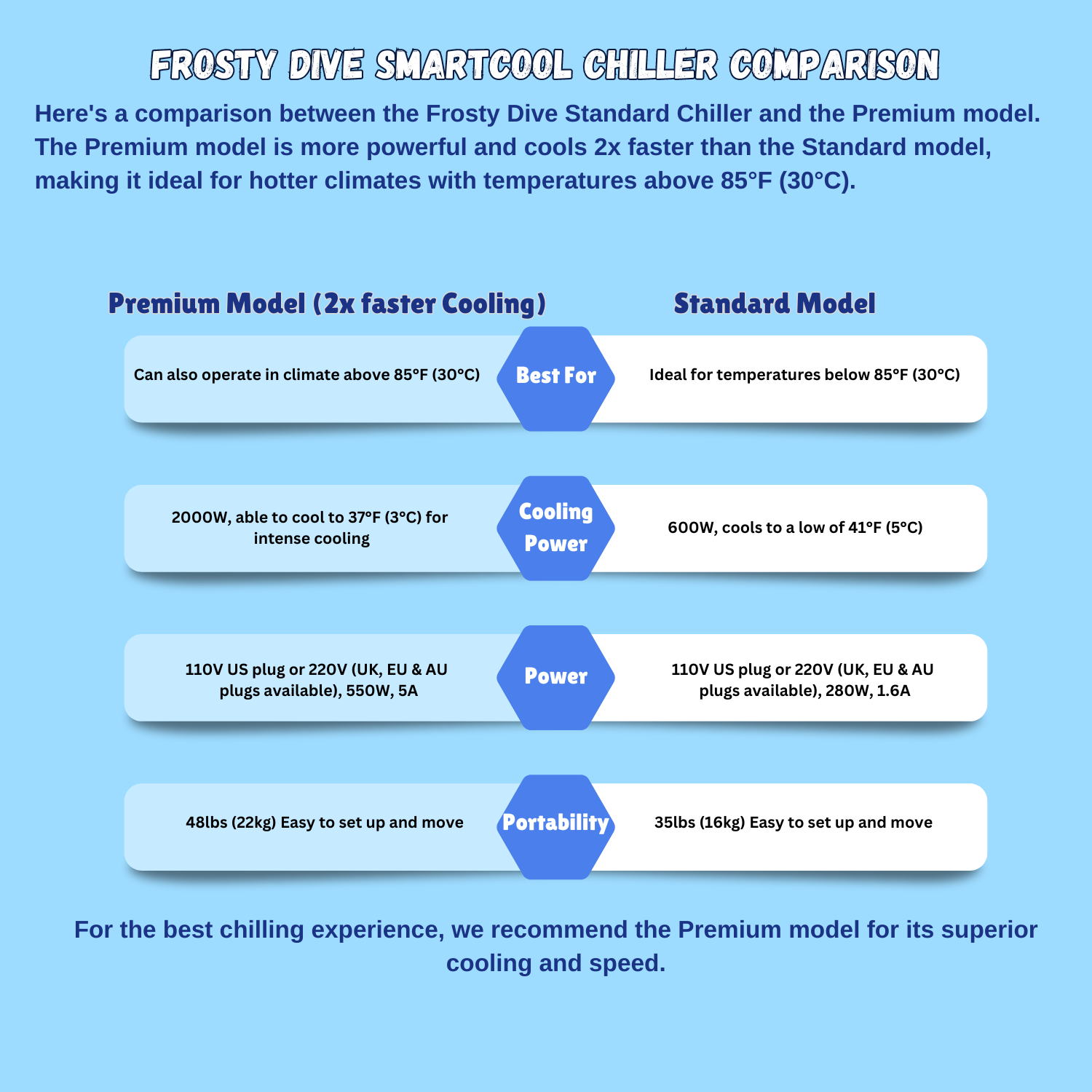 Eliminate the hassle of ice with the Frosty Dive SmartCool Chiller. It quickly cools water to 37°F (3°C) and includes a 20-micron filtration system. Perfect for indoor and outdoor use, it operates efficiently with a 1/3 HP compressor at 280W, or upgrade to 1/2 HP at 550W for faster cooling. Enjoy an easy, powerful cooling experience.